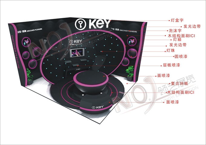 契合KEY的品牌形象和產(chǎn)品特性,采用框型結(jié)構(gòu),再搭配燈具燈光的效果,襯托出展位浪漫、朦朧的氛圍,突出一種尊貴、躍動(dòng)的時(shí)尚品味。