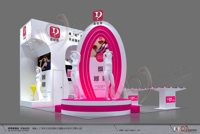 契合的盤絲洞品牌形象和產品特性,采用弧形、矩形結構,再搭配燈具燈光的效果,襯托出展位浪漫、溫馨的氛圍,突出一種青春、激情的時尚品味。