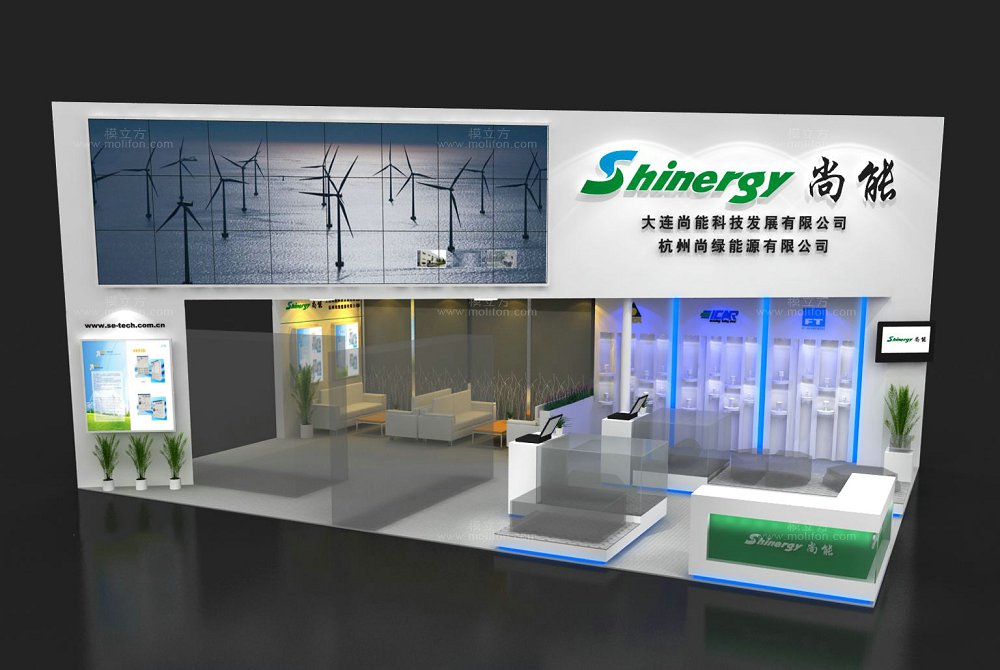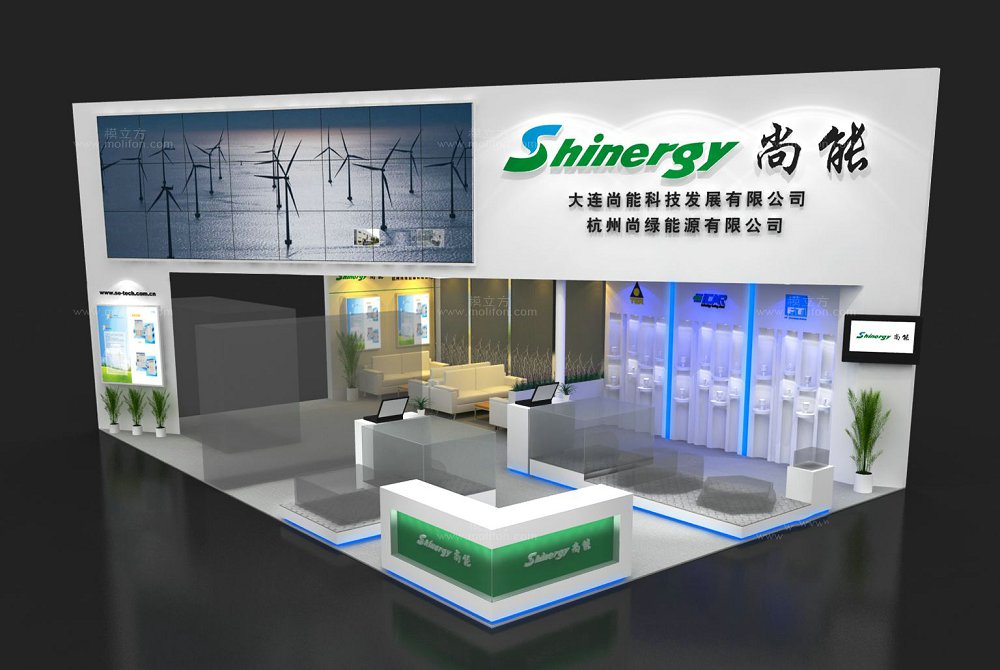 契合尚能的品牌形象和產(chǎn)品特性,采用三角形天花結(jié)構(gòu),再搭配燈具燈光的效果,襯托出展位大氣、豪華的氛圍,突出一種簡約、時尚的品味。