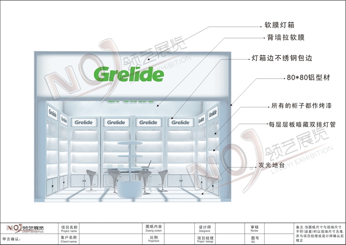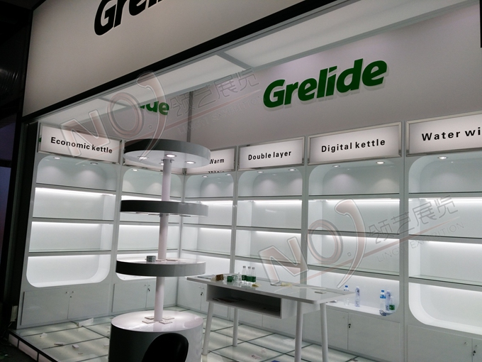 契合格來德的品牌形象和產(chǎn)品特性,采用框型結(jié)構(gòu),再搭配燈具燈光的效果,襯托出展位自由、簡約的氛圍,突出一種現(xiàn)代、舒適的時尚品味。