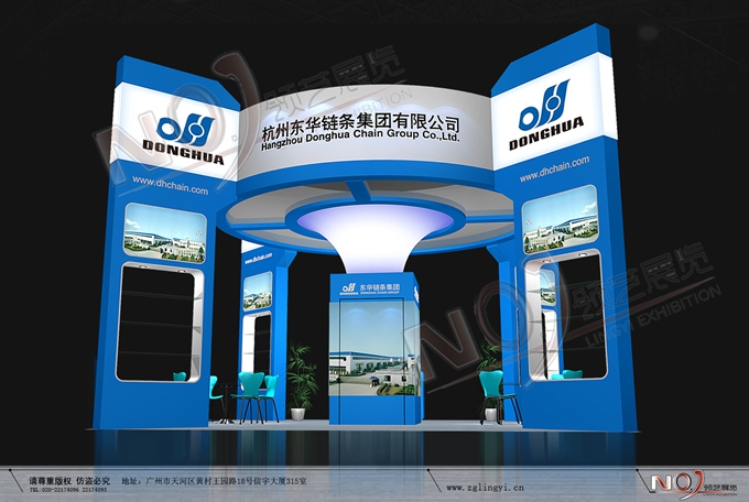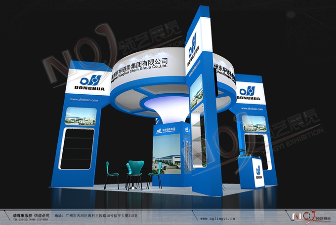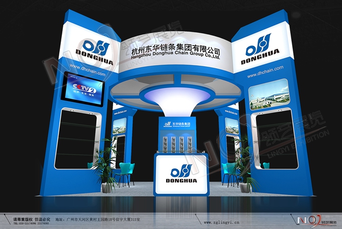 契合東華鏈條的品牌形象和產(chǎn)品特性,采用矩形結(jié)構(gòu),再搭配燈具燈光的效果,襯托出展位高端、時尚的氛圍,突出一種現(xiàn)代、大氣的時尚品味。