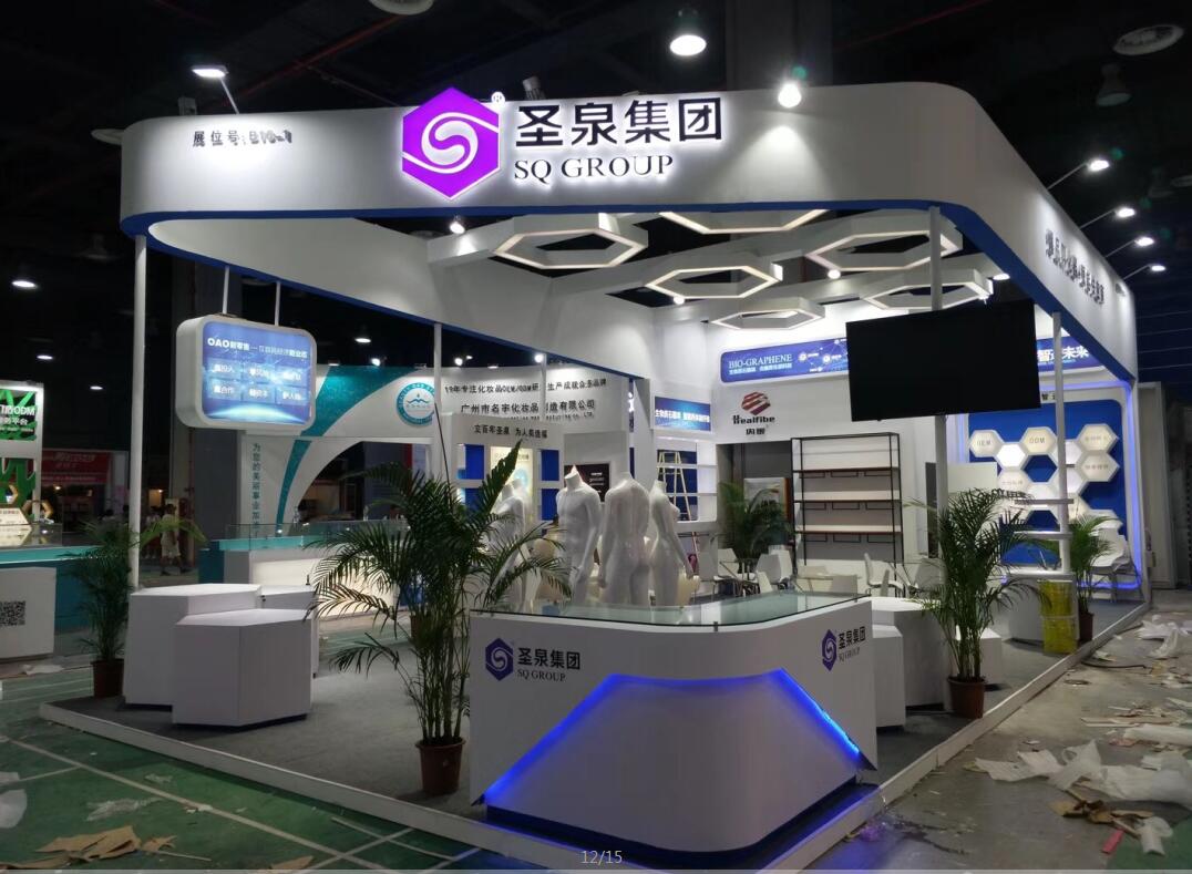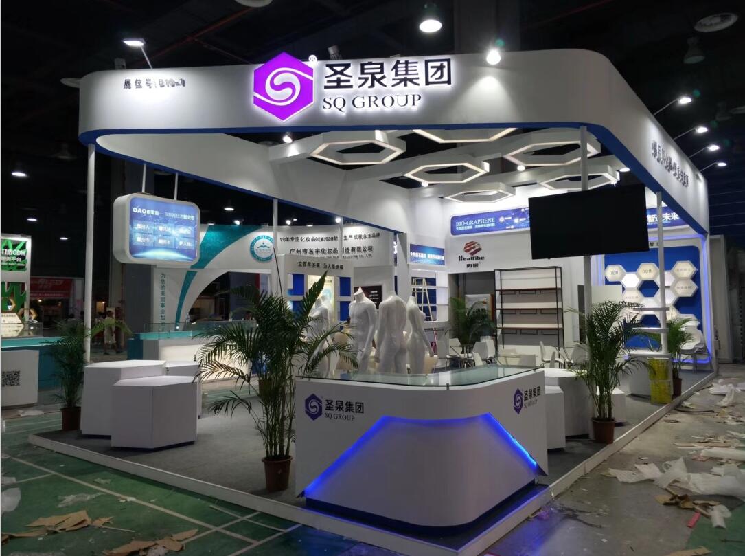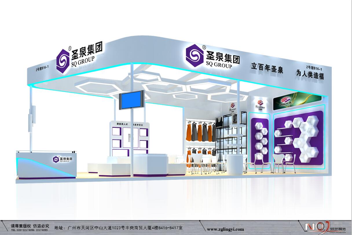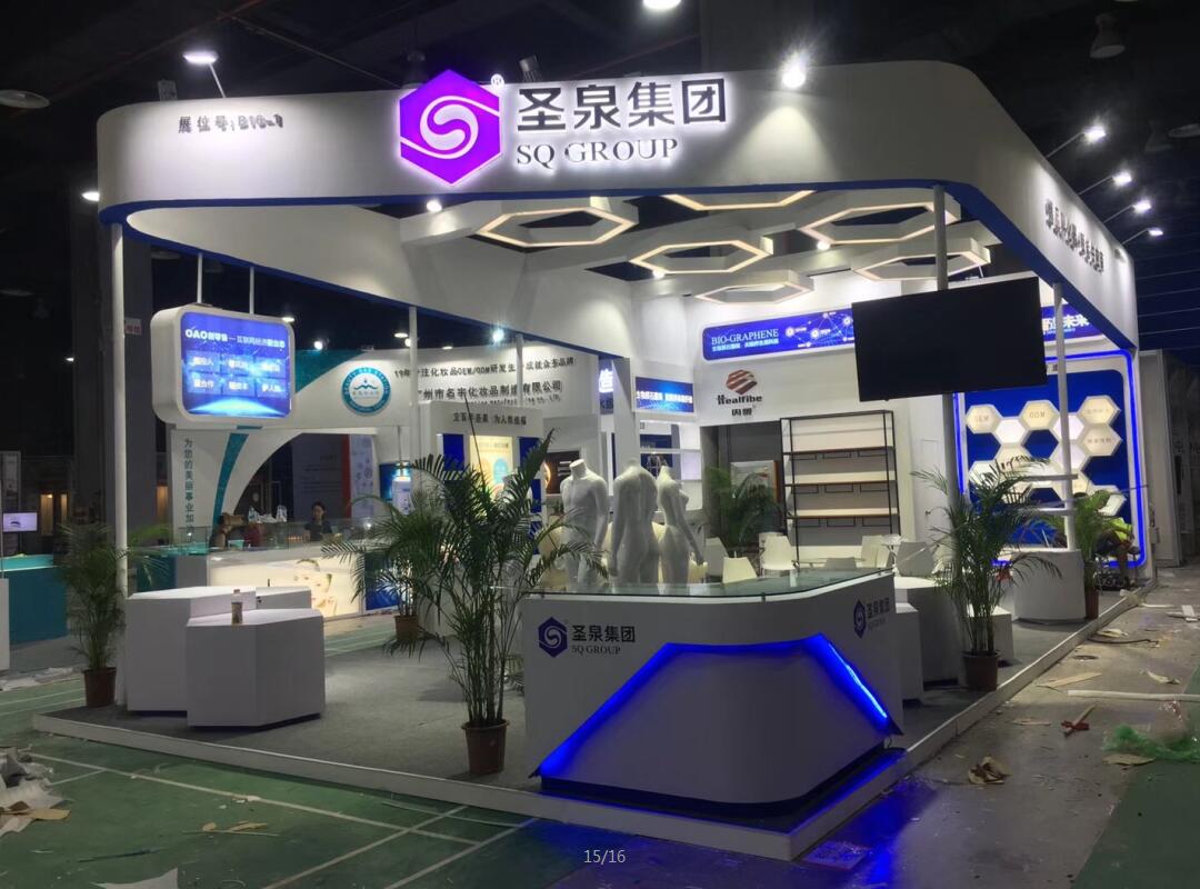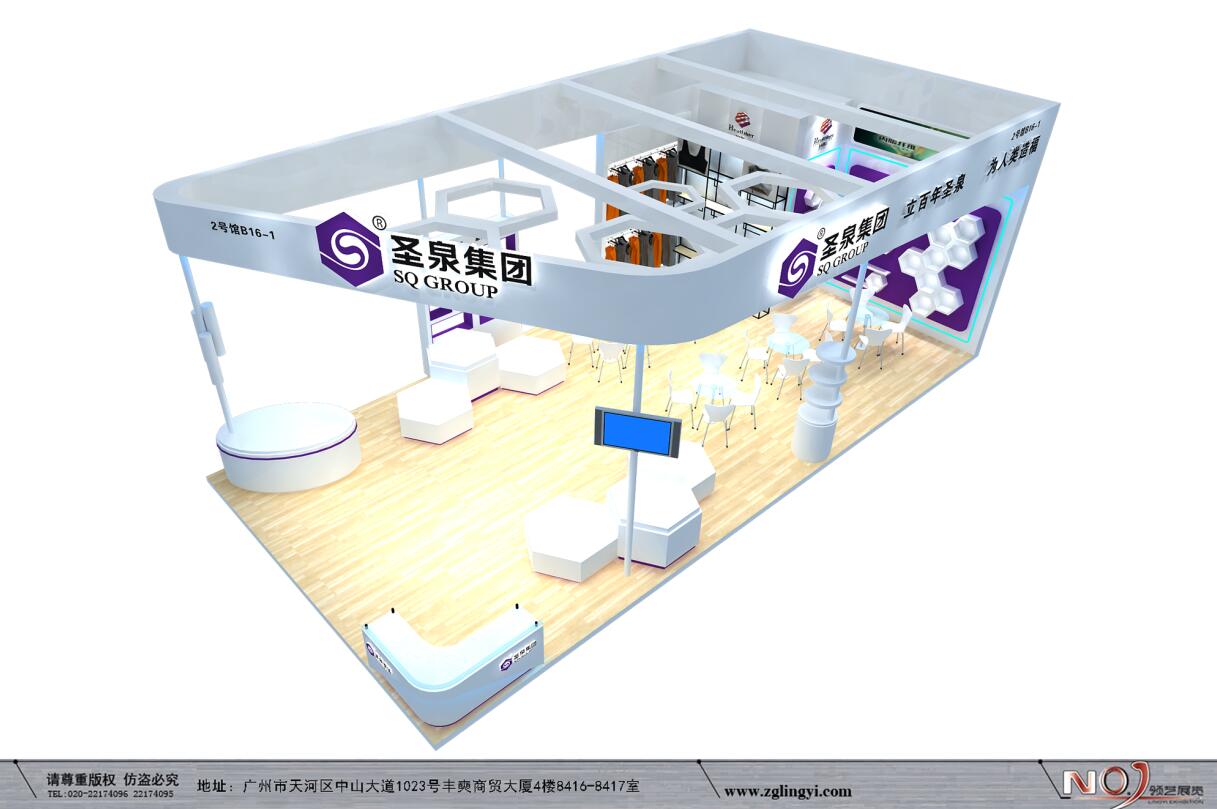 契合山東圣泉品牌形象和產(chǎn)品特性,利用天花造型,再搭配燈具燈光的效果,襯托出展位現(xiàn)代、突出一種現(xiàn)代、高端的時(shí)尚品味。
