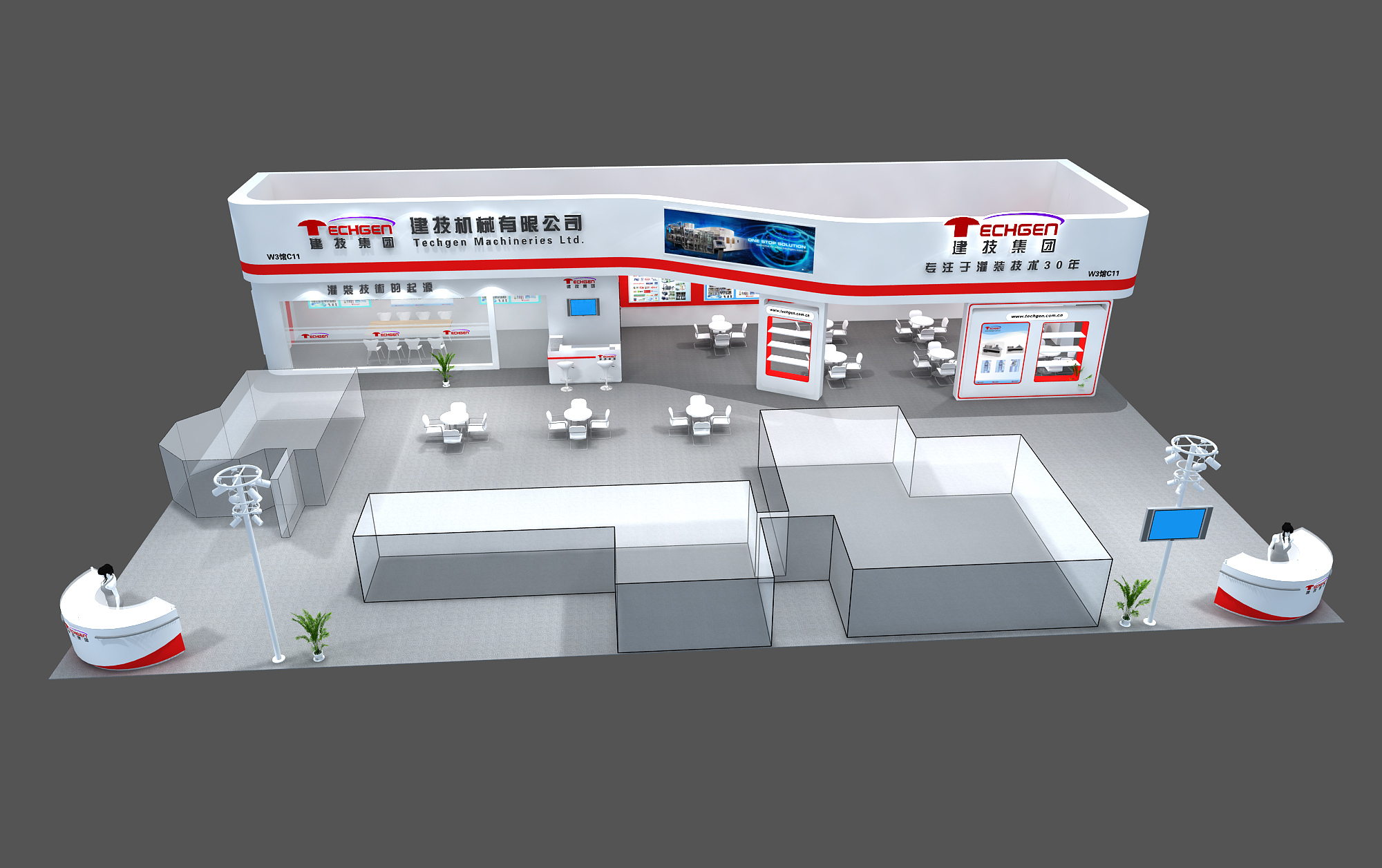 契合建計(jì)集團(tuán)的品牌形象和產(chǎn)品特性,采用矩形結(jié)構(gòu),再搭配燈具燈光的效果,襯托出展位簡(jiǎn)約、舒適的氛圍,突出一種現(xiàn)代、高端的時(shí)尚品味。