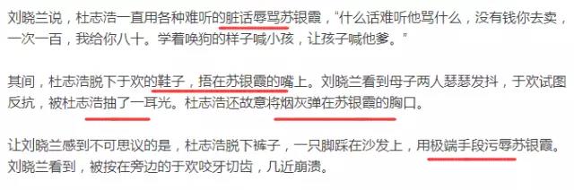 吳學(xué)占讓手下拉屎,并將蘇銀霞按進(jìn)馬桶里,要求還錢。案發(fā)當(dāng)天,蘇銀霞和于歡母子被關(guān)在了一起。“什么話難聽他罵什么,沒有錢你去賣,一次一百,我給你八十。學(xué)著喚狗的樣子喊小孩,讓孩子喊他爹?!倍胖竞泼撓掠跉g的鞋子,捂在蘇銀霞的嘴上。杜志浩脫下褲子,一只腳踩在沙發(fā)上,用極端手段污辱蘇銀霞。一個小時后,失控的于歡,抄起水果刀瘋狂捅向逼債者,結(jié)果四人中刀,其中杜志浩失血過多死亡。