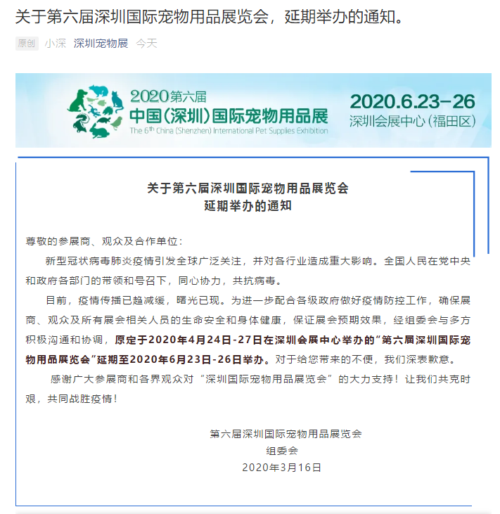 根據(jù)深圳寵物展設(shè)計搭建公司領(lǐng)藝展覽了解到,原定于2020年4月24日-27日在深圳會展中心舉辦的“第六屆深圳國際寵物用品展覽會”延期至2020年6月23日-26日舉辦。如需深圳寵物展設(shè)計請聯(lián)系領(lǐng)藝展覽,希望我們能在深圳寵物展搭建上為您添磚加瓦,祝各位朋友收獲多多,滿載而歸!