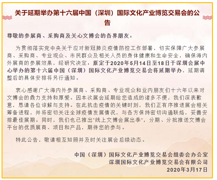 根據(jù)文博會設計搭建公司領藝展覽了解到原定于2020年5月14日至18日于深圳會展中心舉辦的第十六屆中國(深圳)國際文化產業(yè)博覽交易會將延期舉辦,延期調整后的具體安排將另行通知。如需文博會設計請聯(lián)系領藝展覽,希望我們能在文博會搭建上為您添磚加瓦,祝各位朋友收獲多多,滿載而歸!