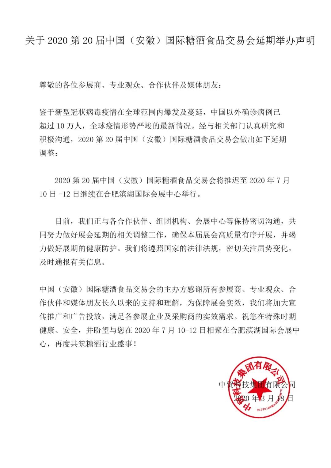 根據(jù)糖酒會設(shè)計搭建公司領(lǐng)藝展覽了解到,2020第20屆中國(安徽)國際糖酒食品交易會將延期舉辦。如需糖酒會展會設(shè)計請聯(lián)系領(lǐng)藝展覽,希望我們能在糖酒會搭建上為您添磚加瓦,祝各位朋友收獲多多,滿載而歸!