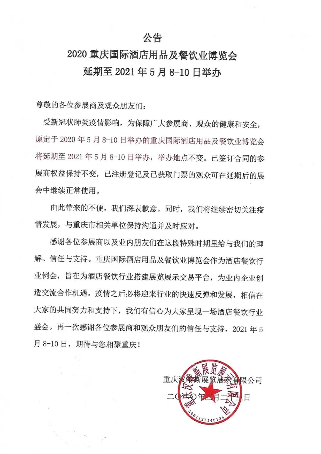 根據(jù)酒店用品展設(shè)計搭建公司領(lǐng)藝展覽了解到,受新冠狀肺炎疫情影響,為保障廣大參展商、觀眾的健康和安全,原定于2020年5月8-10日舉辦的重慶國際酒店用品及餐飲業(yè)博覽會將延期至2021年5月8-10日舉辦,舉辦地點(diǎn)不變。如需酒店用品展設(shè)計請聯(lián)系領(lǐng)藝展覽,希望我們能在酒店用品展搭建上為您添磚加瓦,祝各位朋友收獲多多,滿載而歸!