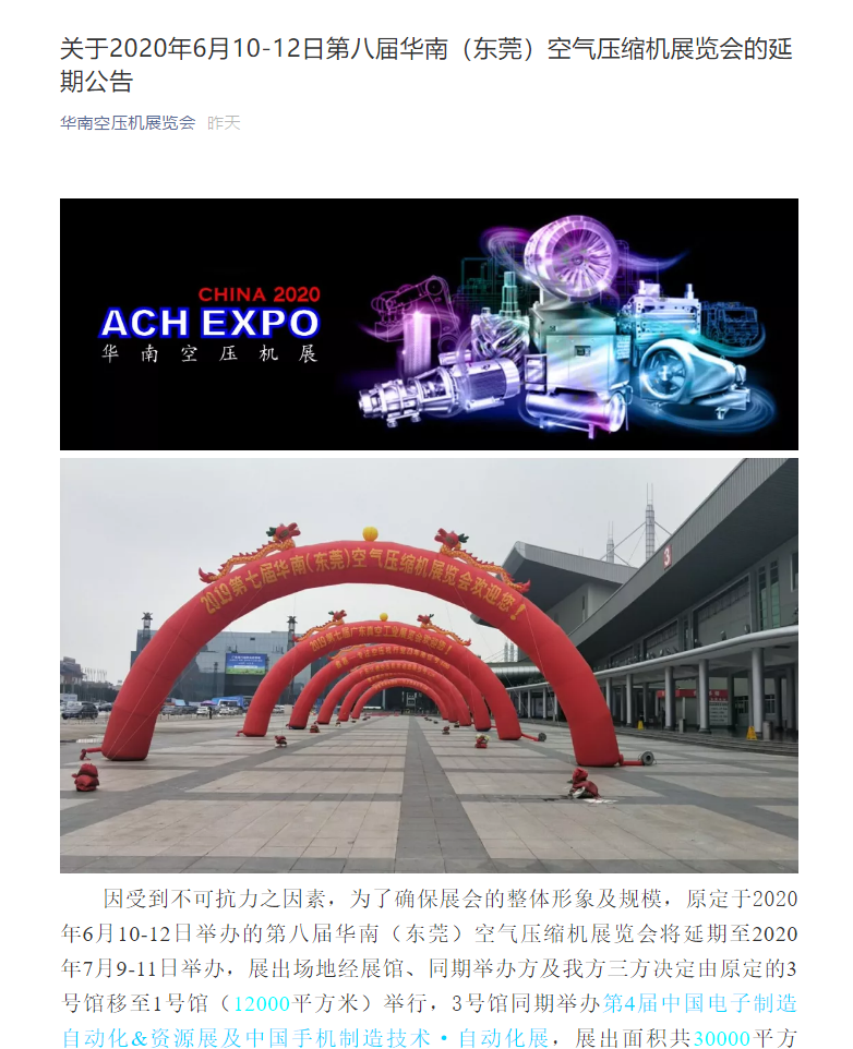根據空壓機展設計搭建公司領藝展覽了解到,原定于2020年6月10-12日舉辦的第八屆華南(東莞)空氣壓縮機展覽會將延期至2020年7月9-11日舉辦,展出場地經展館、同期舉辦方及我方三方決定由原定的3號館移至1號館(12000平方米)舉行,3號館同期舉辦第4屆中國電子制造自動化&資源展及中國手機制造技術·自動化展,展出面積共30000平方米,這將為此次展會帶來更專業(yè)、更有實效性的展出成果。如需空壓機展設計請聯系領藝展覽,希望我們能在空壓機展搭建上為您添磚加瓦,祝各位朋友收獲多多,滿載而歸!