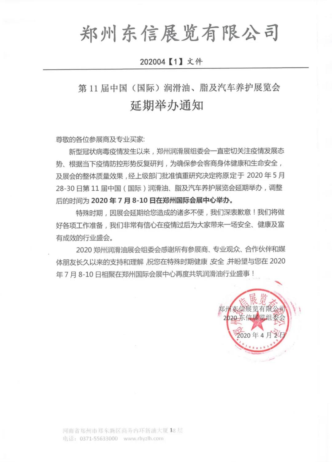根據(jù)潤滑油展設計搭建公司領藝展覽了解到,受新冠肺炎疫情影響,原定于2020年5月28-30日舉辦的第11屆中國潤滑油、脂及汽車養(yǎng)護展覽會延期至2020年7月8-10日在鄭州國際會展中心舉辦。如需潤滑油展設計請聯(lián)系領藝展覽,希望我們能在潤滑油展搭建上為您添磚加瓦,祝各位朋友收獲多多,滿載而歸!