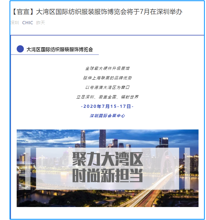 根據(jù)服裝展設(shè)計(jì)搭建公司領(lǐng)藝展覽了解到,中國(guó)紡織工業(yè)聯(lián)合會(huì)應(yīng)運(yùn)推出大灣區(qū)國(guó)際紡織服裝服飾博覽會(huì)(簡(jiǎn)稱“大灣區(qū)紡博會(huì)”),集結(jié)四大專業(yè)展會(huì)——大灣區(qū)國(guó)際紡織面料及輔料博覽會(huì)、大灣區(qū)國(guó)際服裝服飾博覽會(huì)、大灣區(qū)國(guó)際針織博覽會(huì)、大灣區(qū)國(guó)際紡織紗線博覽會(huì),將以近12萬(wàn)平方米的展出規(guī)模,于2020年7月15日~17日亮相深圳國(guó)際會(huì)展中心。如需服裝展設(shè)計(jì)請(qǐng)聯(lián)系領(lǐng)藝展覽,希望我們能在服裝展搭建上為您添磚加瓦,祝各位朋友收獲多多,滿載而歸!