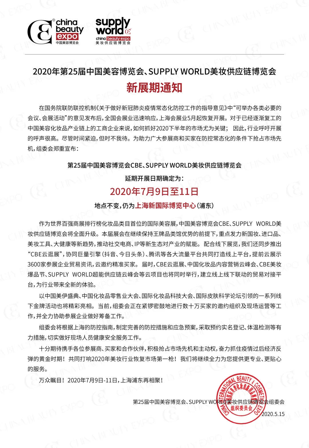 根據(jù)美容博覽會指定設(shè)計搭建公司領(lǐng)藝展覽了解到,原定于2020年5月19日至21日在上海新國際博覽中心舉辦的第25屆中國美容博覽會CBE、SUPPLY WORLD美妝供應(yīng)鏈博覽會及所有同期相關(guān)活動,將延期至2020年7月9-11日舉行,舉辦地點不變。如需美容博覽會設(shè)計請聯(lián)系領(lǐng)藝展覽,希望我們能在美容博覽會搭建上為您添磚加瓦,祝各位朋友收獲多多,滿載而歸!
