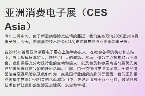 7月13日,亞洲消費(fèi)電子展(CES Asia)官方發(fā)布公告稱,正式停辦在上海舉辦5年之久的亞洲消費(fèi)電子展。