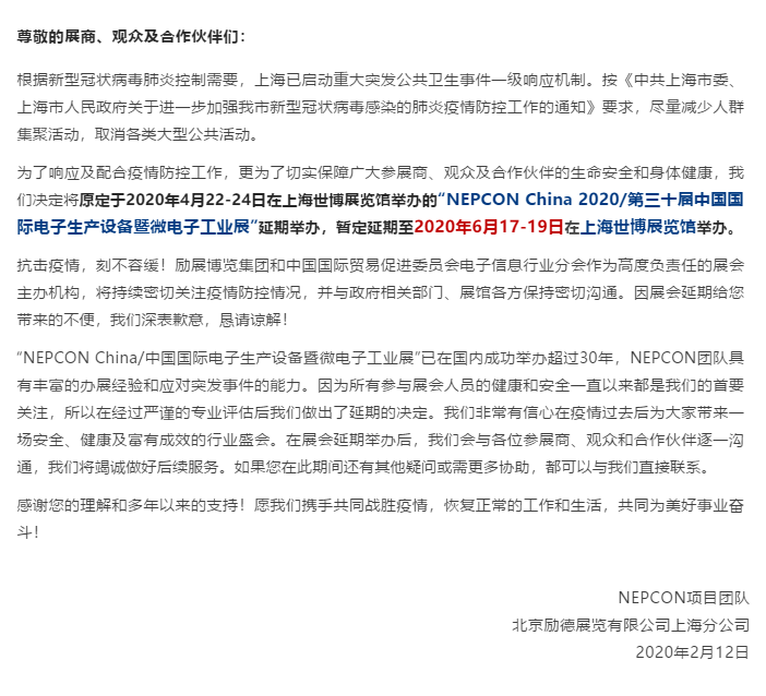 根據(jù)上海電子展設(shè)計搭建公司領(lǐng)藝展覽解到為了響應(yīng)及配合疫情防控工作,更為了切實保障廣大參展商、觀眾及合作伙伴的生命安全和身體健康,我們決定將原定于2020年4月22-24日在上海世博展覽館舉辦的“NEPCON China 2020/第三十屆中國國際電子生產(chǎn)設(shè)備暨微電子工業(yè)展”延期舉辦,暫定延期至2020年6月17-19日在上海世博展覽館舉辦。領(lǐng)藝展覽為您上海電子展設(shè)計搭建保駕護航。