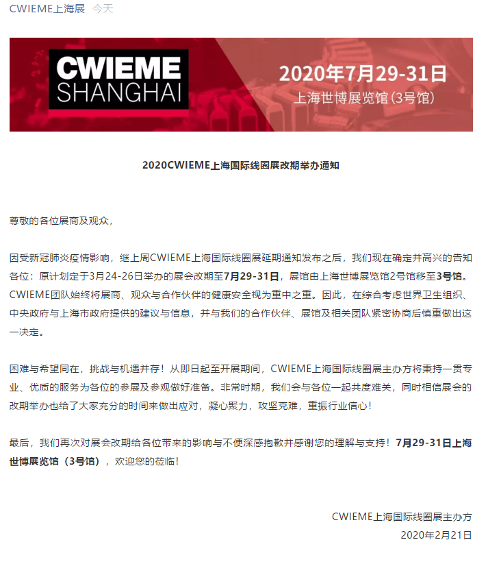 根據(jù)上海線圈展設(shè)計(jì)搭建公司領(lǐng)藝展覽了解到,因受新冠肺炎疫情影響,繼上周CWIEME上海國際線圈展延期通知發(fā)布之后,原計(jì)劃定于3月24-26日舉辦的展會(huì)改期至7月29-31日。如需線圈展設(shè)計(jì)請(qǐng)聯(lián)系領(lǐng)藝展覽,希望我們能在線圈展搭建上為您添磚加瓦,祝各位朋友收獲多多,滿載而歸!