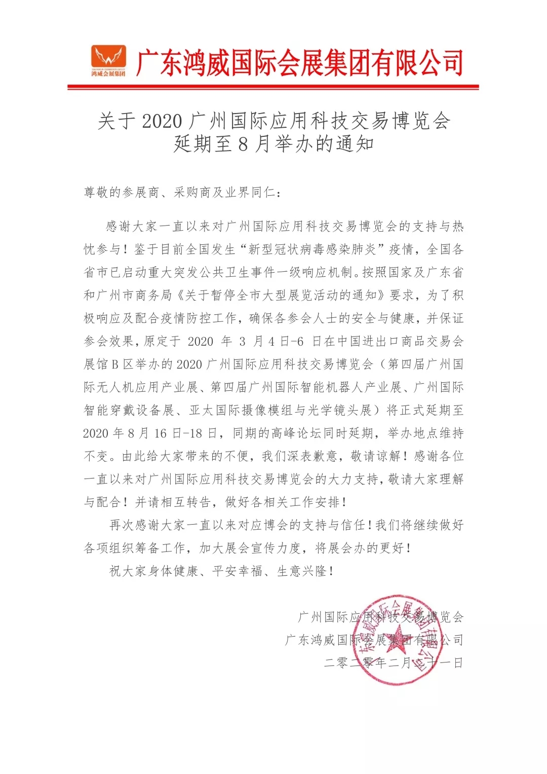 根據(jù)應用科技展設(shè)計搭建公司領(lǐng)藝展覽解到,鑒于目前全國發(fā)生“新型冠狀病毒感染肺炎”疫情,全國各省市已啟動重大突發(fā)公共衛(wèi)生事件一級響應機制。按照國家及廣東省和廣州市商務局《關(guān)于暫停全市大型展覽活動的通知》要求,為了積極響應及配合疫情防控工作,確保各參會人士的安全與健康,并保證參會效果,原定于2020年3月4日-6日在中國進出口商品交易會展館B區(qū)舉辦的2020廣州國際應用科技交易博覽會(第四屆廣州國際無人機應用產(chǎn)業(yè)展、第四屆廣州國際智能機器人產(chǎn)業(yè)展、廣州國際智能穿戴設(shè)備展、亞太國際攝像模組與光學鏡頭展)將正式延期至2020年8月16日-18日,同期的高峰論壇同時延期,舉辦地點維持不變。如需應用科技展設(shè)計請聯(lián)系領(lǐng)藝展覽,希望我們能在應用科技展搭建上為您添磚加瓦,祝各位朋友收獲多多,滿載而歸!