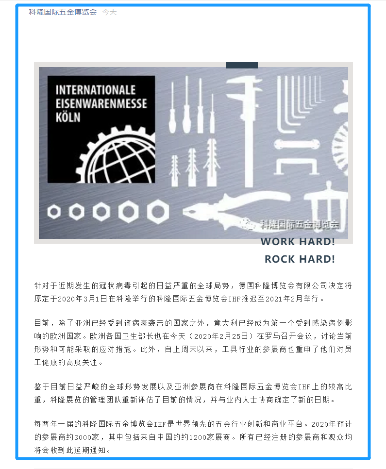 目前,除了亞洲已經(jīng)受到該病毒襲擊的國家之外,意大利已經(jīng)成為第一個受到感染病例影響的歐洲國家。歐洲各國衛(wèi)生部長也在今天(2020年2月25日)在羅馬召開會議,討論當(dāng)前形勢和可能采取的應(yīng)對措施。此外,自上周末以來,工具行業(yè)的參展商也重申了他們對員工健康的高度關(guān)注。鑒于目前日益嚴(yán)峻的全球形勢發(fā)展以及亞洲參展商在科隆國際五金博覽會IHF上的較高比重,科隆展覽的管理團隊重新評估了目前的情況,并與業(yè)內(nèi)人士協(xié)商確定了新的日期。每兩年一屆的科隆國際五金博覽會IHF是世界領(lǐng)先的五金行業(yè)創(chuàng)新和商業(yè)平臺。2020年預(yù)計的參展商約3000家,其中包括來自中國的約1200家展商。所有已經(jīng)注冊的參展商和觀眾均將會收到此延期通知。如需五金展設(shè)計請聯(lián)系領(lǐng)藝展覽,希望我們能在五金展搭建上為您添磚加瓦,祝各位朋友收獲多多,滿載而歸!