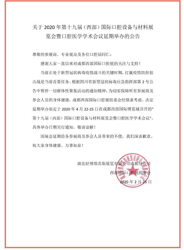 根據(jù)成都西部國際口腔展設(shè)計(jì)搭建公司領(lǐng)藝展覽了解到,當(dāng)前正處于新型冠狀病毒疫情戰(zhàn)斗的關(guān)鍵時期,打贏疫情防控狙擊戰(zhàn)是當(dāng)前首要任務(wù)。根據(jù)四川省新型冠狀病毒應(yīng)急指揮部第2號公告中暫停一切群體性聚集活動的通知精神,為保障所有參展商及參會人員的安全和健康,成都西部國際口腔展組委會經(jīng)慎重考慮,決定延期舉辦原定于2020年4月22-25日在成都西部國際博覽城召開的“第十九屆(西部)國際口腔設(shè)備與材料展覽會暨口腔醫(yī)學(xué)學(xué)術(shù)會議”,具體舉辦日期另行通知,敬請諒解!如需成都口腔展設(shè)計(jì)請聯(lián)系領(lǐng)藝展覽,希望我們能在口腔展搭建上為您添磚加瓦,祝各位朋友收獲多多,滿載而歸!