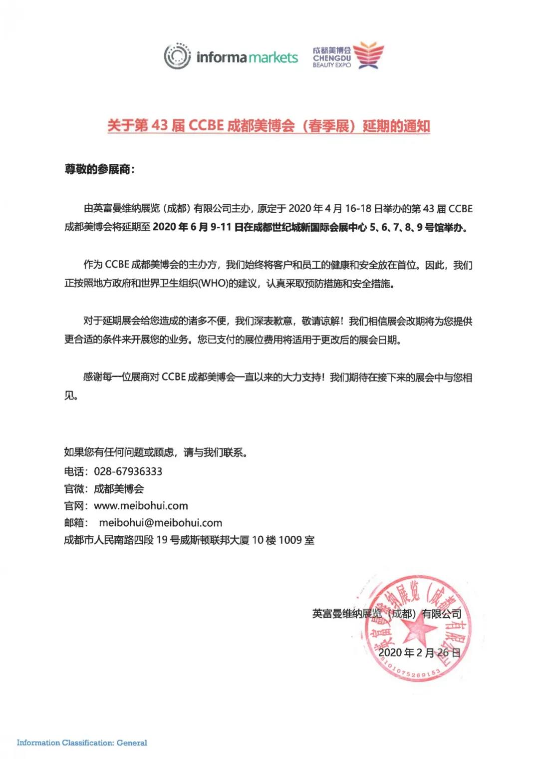 根據(jù)成都美博會設計搭建公司領藝展覽了解到,受新型冠狀病毒肺炎疫情影響。第43屆CCBE成都美博會延期至6月9日-11日在成都世紀城會展中心舉辦。如需成都美博會設計請聯(lián)系領藝展覽,希望我們能在成都美博會搭建上為您添磚加瓦,祝各位朋友收獲多多,滿載而歸