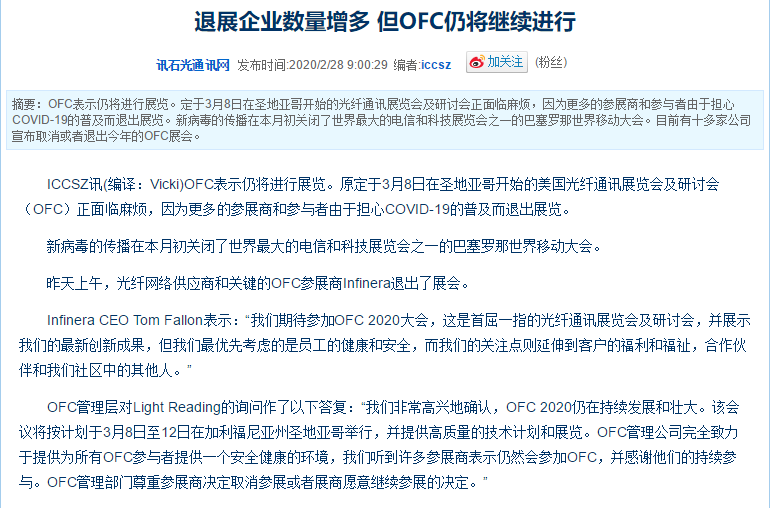 根據(jù)光纖通訊展設計搭建公司領藝展覽了解到,Infinera CEO Tom Fallon表示:“我們期待參加OFC 2020大會,這是首屈一指的光網(wǎng)絡會議,并展示我們的最新創(chuàng)新成果,但我們最優(yōu)先考慮的是員工的健康和安全,而我們的關注點則延伸到客戶的福利和福祉,合作伙伴和我們社區(qū)中的其他人?!監(jiān)FC管理層對Light Reading的詢問作了以下答復:“我們非常高興地確認,OFC 2020仍在持續(xù)發(fā)展和壯大。該會議將按計劃于3月8日至12日在加利福尼亞州圣地亞哥舉行,并提供高質量的技術計劃和展覽。OFC管理公司完全致力于提供為所有OFC參與者提供一個安全健康的環(huán)境,我們聽到許多參展商表示仍然會參加OFC,并感謝他們的持續(xù)參與。OFC管理部門尊重參展商決定取消參展并愿意合作的決定。”如需光纖通訊展設計請聯(lián)系領藝展覽,希望我們能在光纖通訊展搭建上為您添磚加瓦,祝各位朋友收獲多多,滿載而歸!