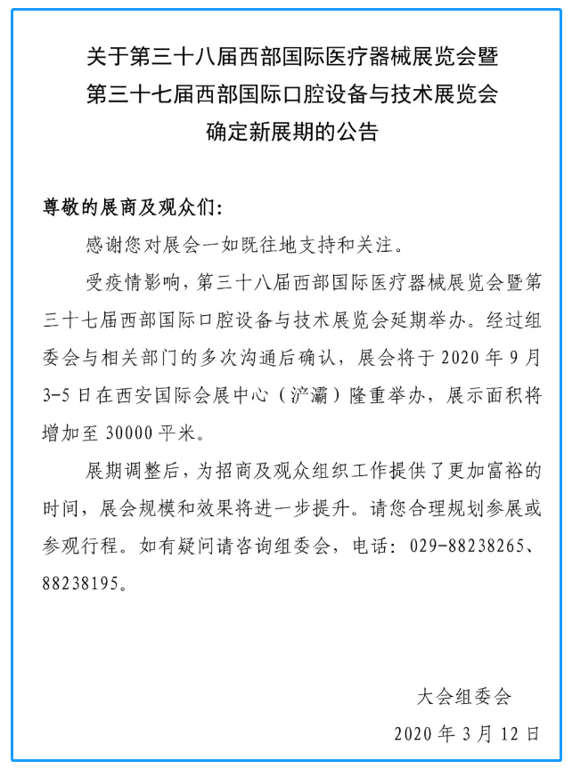 根據(jù)西部醫(yī)療展設(shè)計搭建公司領(lǐng)藝展覽了解到,受疫情影響,第三十八屆西部國際醫(yī)療器械展覽會調(diào)整至2020年9月3-5日在西安國際會展中心(浐灞)隆重舉辦。如需西部醫(yī)療展設(shè)計請聯(lián)系領(lǐng)藝展覽,希望我們能在西部醫(yī)療展搭建上為您添磚加瓦,祝各位朋友收獲多多,滿載而歸!