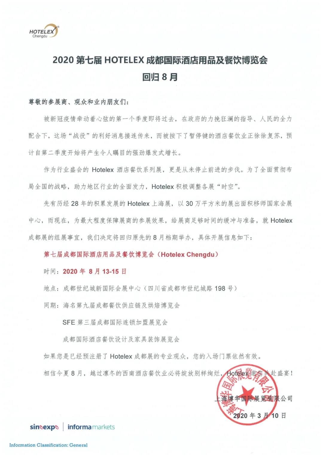 根據(jù)餐博會設(shè)計(jì)搭建公司領(lǐng)藝展覽了解到,2020 HOTELEX成都,為肩負(fù)起復(fù)興西南酒店餐飲行業(yè)的光榮使命,為最大程度保障展商的參展效果,并營造舒適安全的參展觀展環(huán)境,幾經(jīng)慎重商榷,辦展時(shí)間回歸8月,確定為2020年 8月13-15日。如需餐博會設(shè)計(jì)請聯(lián)系領(lǐng)藝展覽,希望我們能在餐博會搭建上為您添磚加瓦,祝各位朋友收獲多多,滿載而歸!