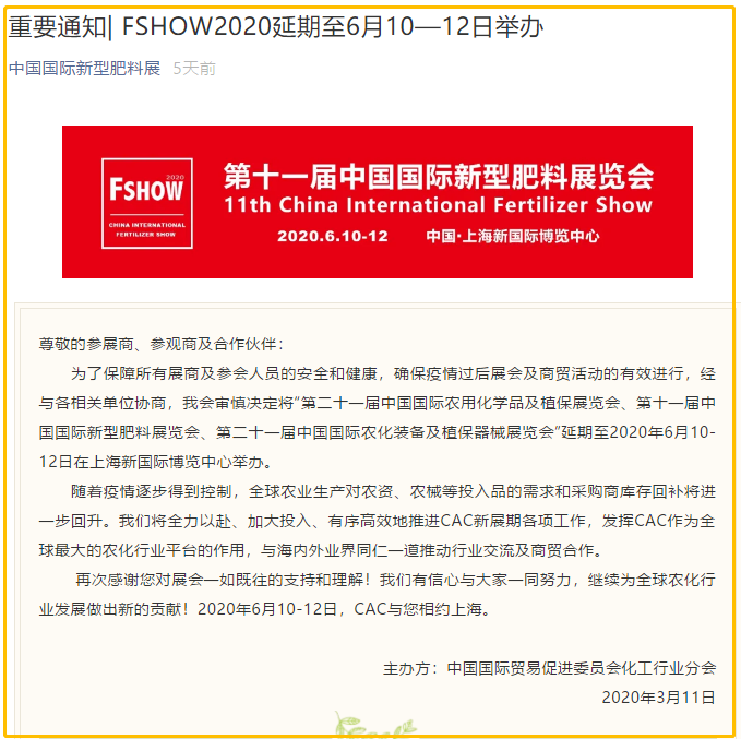 根據(jù)上海展會設(shè)計搭建公司領(lǐng)藝展覽了解到,第二十一屆中國國際農(nóng)用化學(xué)品及植保展覽會、第十一屆中國國際新型肥料展覽會、第二十一屆中國國際農(nóng)化裝備及植保器械展覽會”延期至2020年6月10-12日在上海新國際博覽中心舉辦。如需上海展會設(shè)計請聯(lián)系領(lǐng)藝展覽,希望我們能在上海展會搭建上為您添磚加瓦,祝各位朋友收獲多多,滿載而歸!