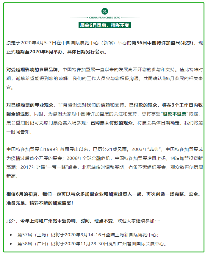 根據(jù)北京展會(huì)設(shè)計(jì)搭建公司領(lǐng)藝展覽了解到,原定于2020年4月5-7日在中國(guó)國(guó)際展覽中心(新館)舉辦的第56屆中國(guó)特許加盟展(北京),現(xiàn)正式延期至2020年6月舉辦,具體日期另行公示。如需北京展會(huì)設(shè)計(jì)請(qǐng)聯(lián)系領(lǐng)藝展覽,希望我們能在北京展會(huì)搭建上為您添磚加瓦,祝各位朋友收獲多多,滿載而歸!