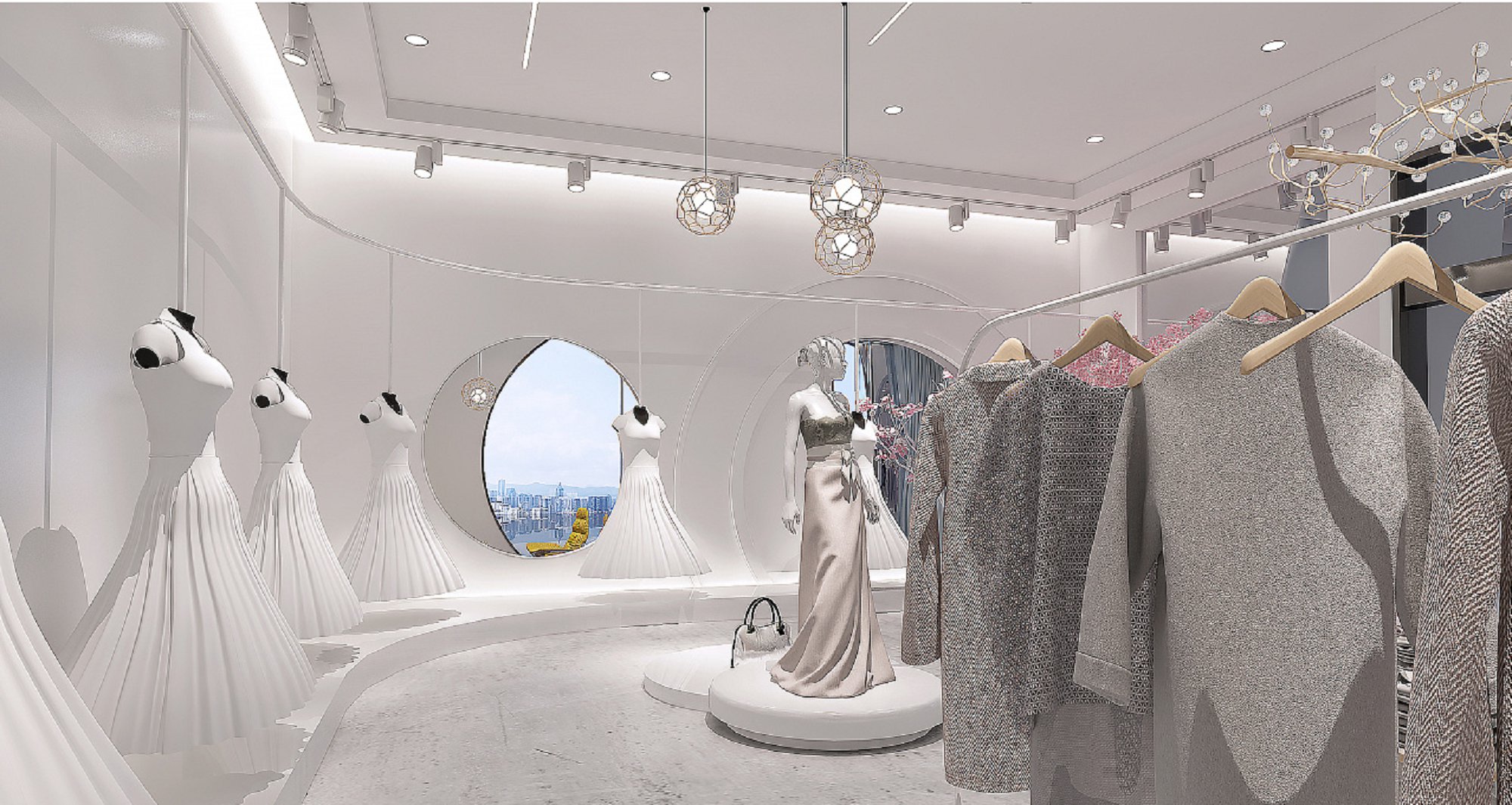 契合EIsissil服裝的品牌形象和產(chǎn)品特性,采用開放式結(jié)構(gòu)進(jìn)行合理的分區(qū),再搭配燈具燈光的效果,襯托出展廳大氣、豪華的氛圍,突出一種簡約、時(shí)尚的品味。