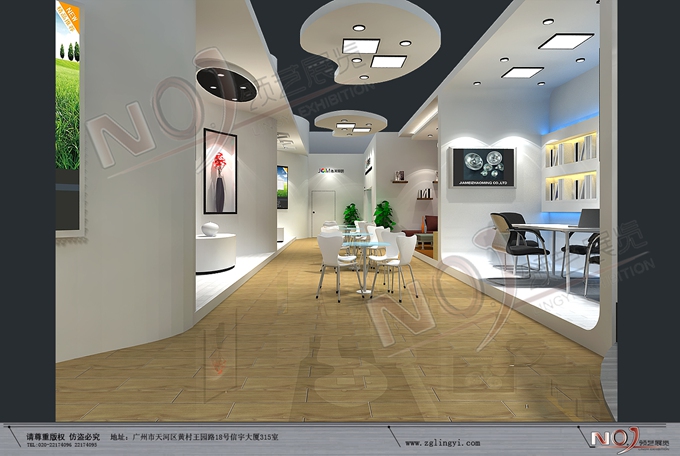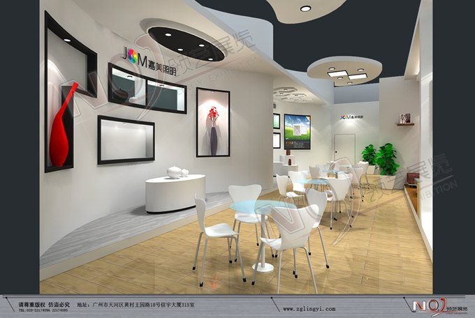 契合嘉美的品牌形象和產品特性,采用弧形、矩形結構,再搭配燈具燈光的效果,襯托出展位時尚、簡約的氛圍,突出一種現代、活力的時尚品味。
